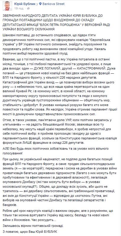 11 апреля экс-свободовец Юрий Бублик решил войти в состав парламентской фракции «Блок Петра Порошенко». О чем и сообщил на своей странице в Facebook.