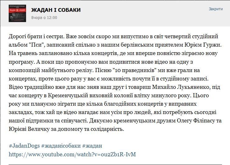 Вчора в соціальних мережах «Жадан і собаки» презентували нове відео на одну з композицій майбутнього релізу. Кліп на пісню «10 праведників» був відзнятий під час концерту в Кременчуцькій виховній колонії влітку минулого року.