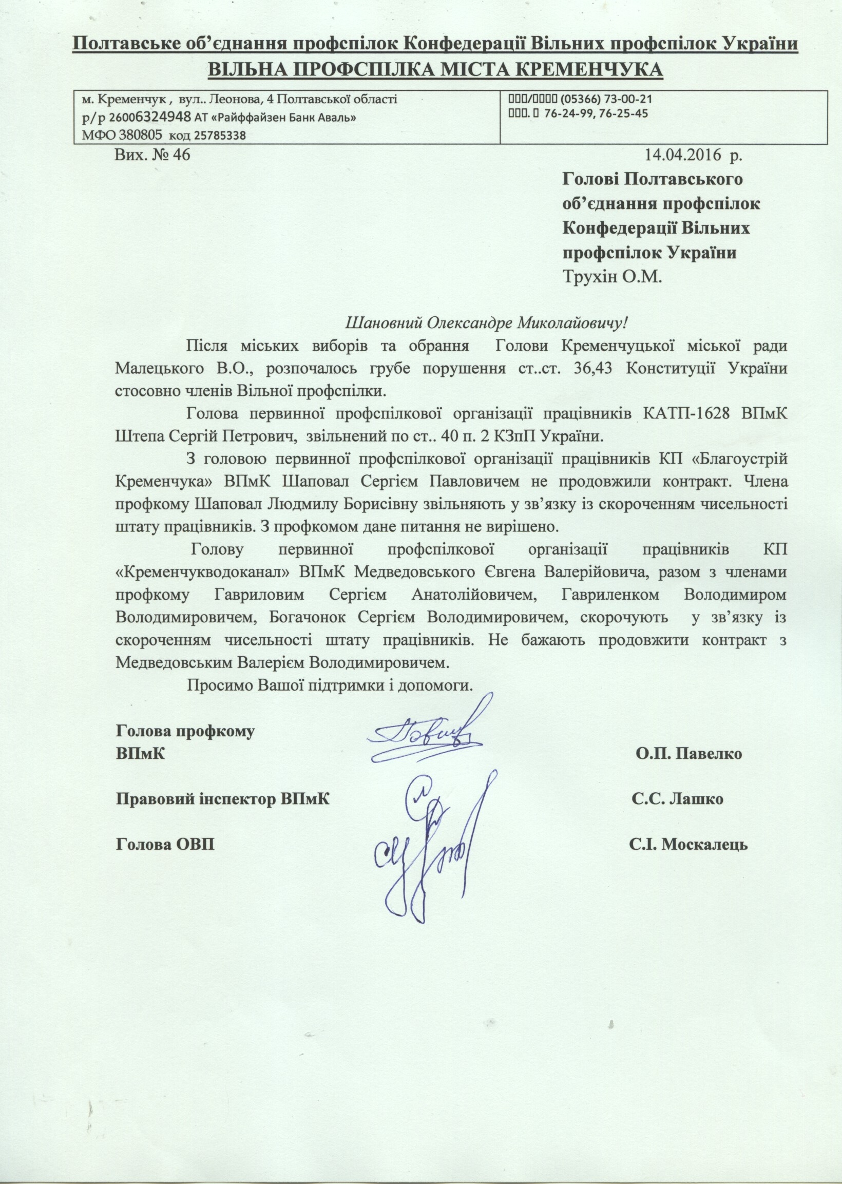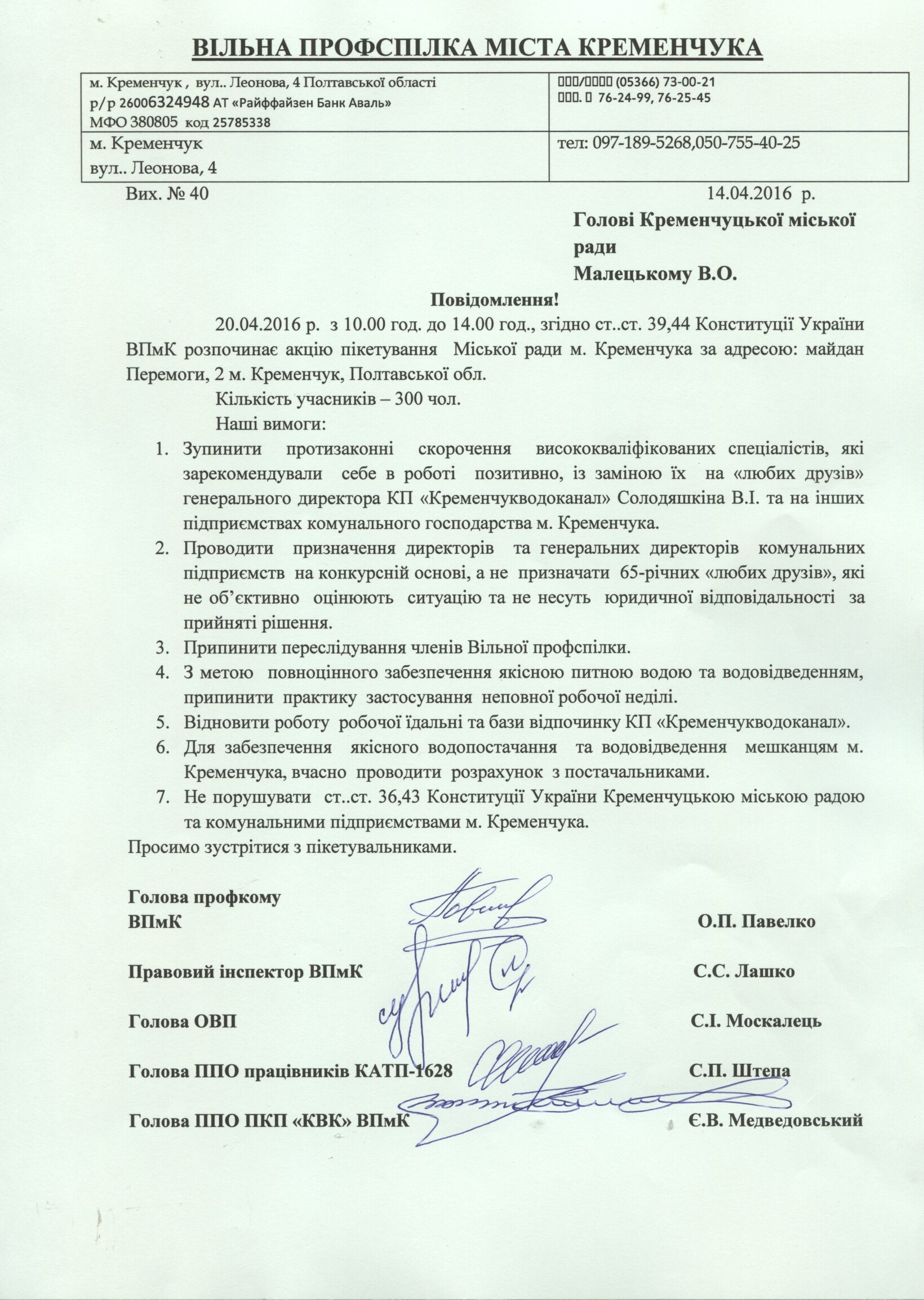 20 квітня з 10.00 до 11.30 члени Вільної профспілки влаштувли пікет перед мерією Кременчука на площі Перемоги, вимагаючи від мера Малецкого не звільняти членів їх організації з комунальних підприємств – «Кременчугводоканала», «Благоустрою Кременчука», і «КАТП-1628»