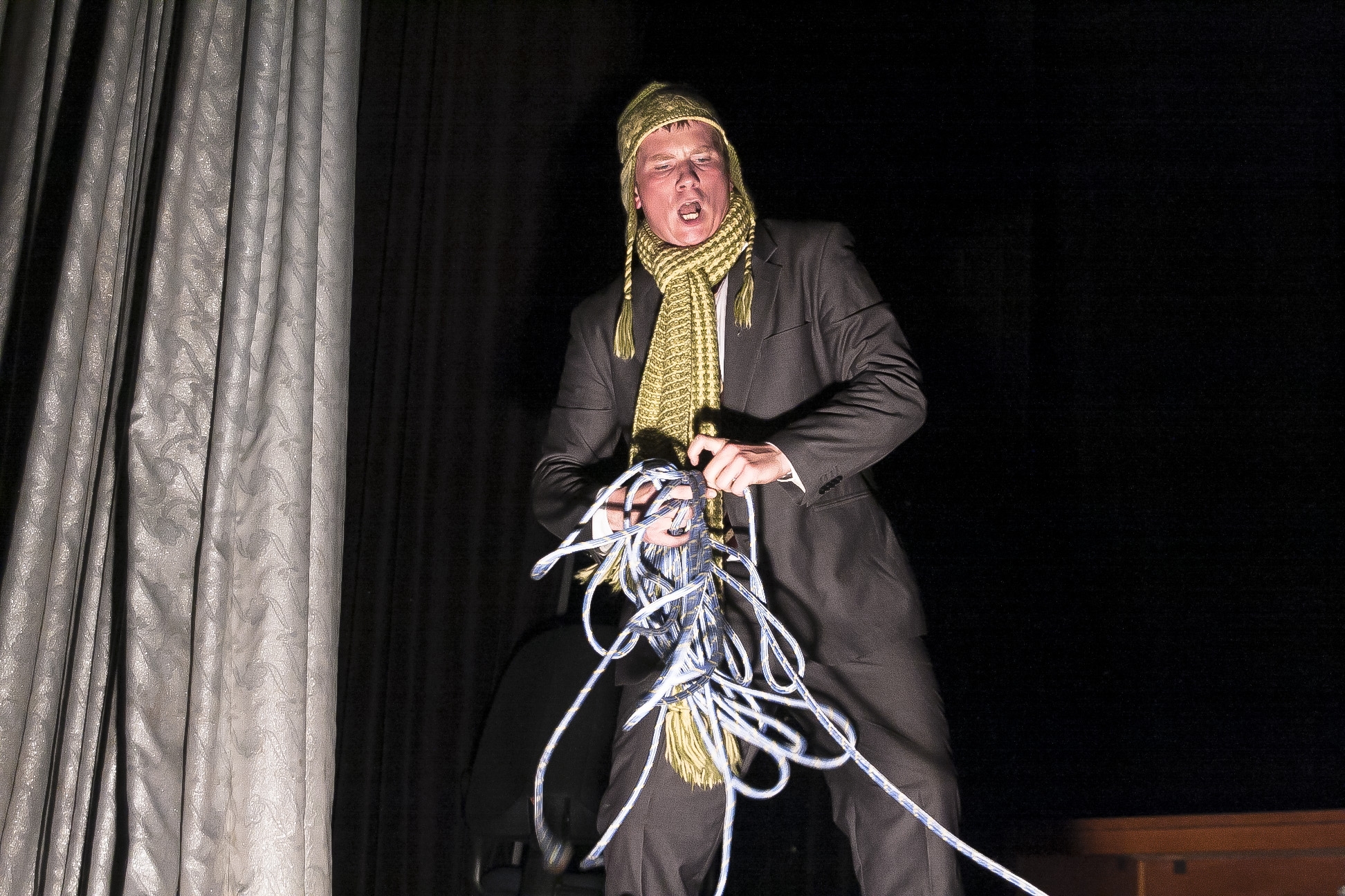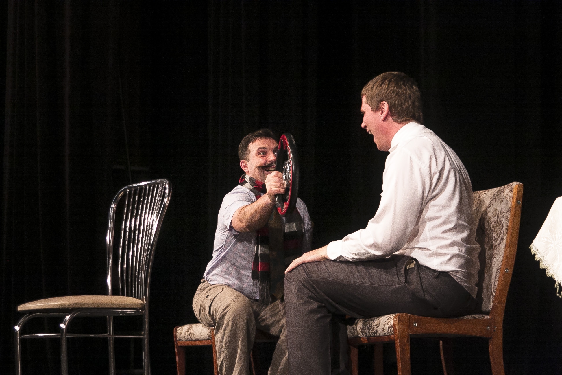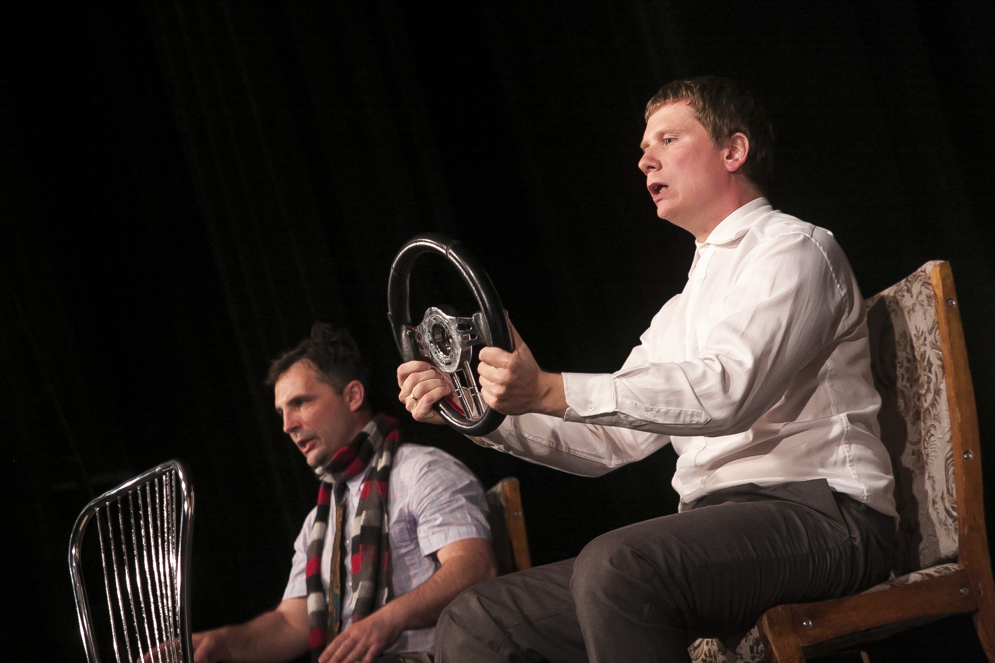 В постановке же Максима Воробьева спектакль начинается с риторического вопроса ученика:"Сцы или не сцы? Вот в чём вопрос!". Оказалось, что не "сцы", а сцепление - так будущий водитель готовился к здаче экзамена по вождению, ведь сейчас к нему должен прийти инструктор.