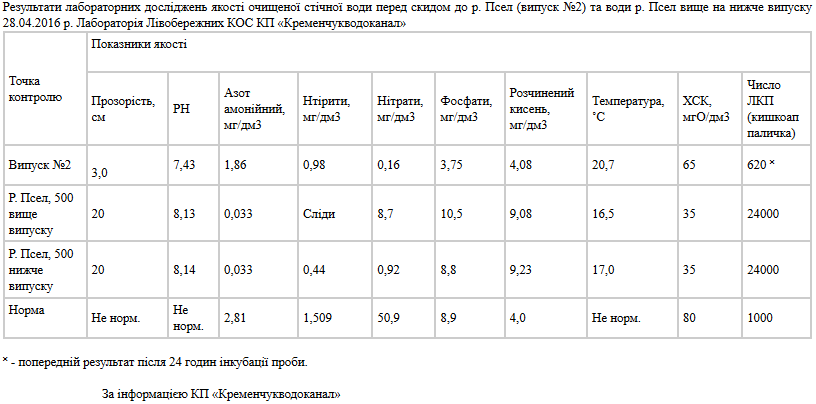 По результатам лабораторных исследований проб воды, которые отбирали специалисты «Кременчугводоканала» 28 и 29 апреля в месте сброса воды в Псёл и в 500 метрах ниже по течению, вода соответствует норме по химическим и бактериологическим показателям.