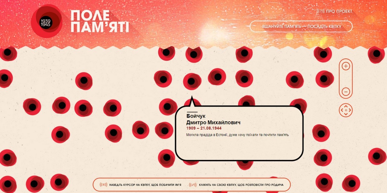 Поле Пам’яті – це інтерактивний проект, що покликаний допомогти кожному з нас вшанувати людей, яким довелось боротися за свою свободу і життя, та за наше майбутнє.