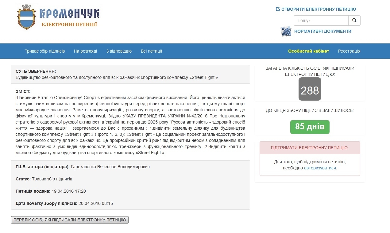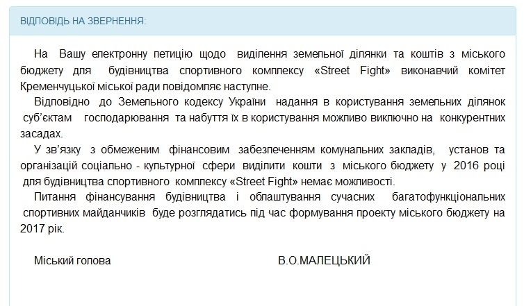 17 травня мер Кременчука Віталій Малецький відповів на петицію Вячеслава Гарькавенка з проханням про будівництво безкоштовного та доступного для всіх охочих спортивного комплексу «Street Fight».