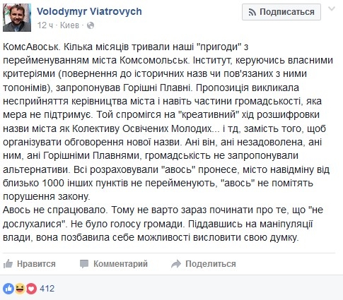 «КомсАвоськ. Кілька місяців тривали наші «пригоди» з перейменуванням міста Комсомольськ. Інститут, керуючись власними критеріями (повернення до історичних назв чи пов'язаних з ними топонімів), запропонував Горішні Плавні. Пропозиція викликала несприйняття керівництва міста і навіть частини громадськості, яка мера не підтримує. Той спромігся на «креативний» хід розшифровки назви міста як Колективу Освічених Молодих... і тд, замість того, щоб організувати обговорення нової назви. Ані він, ані не задоволена, ані ним, ані Горішніми Плавнями, громадськість не запропонували альтернативи. Всі розраховували «авось» пронесе, місто на відміну від близько 1000 інших пунктів не перейменують, «авось» не помітять порушення закону. Авось не спрацювало. Тому не варто зараз починати про те, що «не дослухалися». Не було голосу громади. Піддавшись на маніпуляції влади, вона позбавила себе можливості висловити свою думку», – Владимир Вятрович.