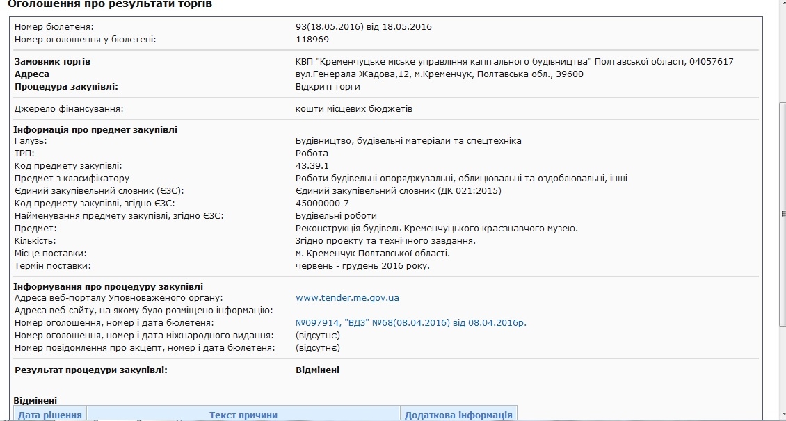 Краеведческий музей в Кременчуге реконструировать некому – открытые конкурсные торги, назначенные на 17 мая, не состоялись. Такая информация содержится на официальном портале госзакупок. Причина отмены тендера – на конкурс подано менее двух предложений участников. Конкурс проводило коммунально-производственное предприятие «Кременчугское городское управление капитального строительства», он был объявлен 8 апреля (дата публикации официального объявления на портале госзакупок).