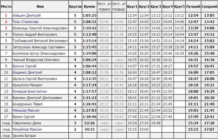 П'єдестал пошани поділили між собою гонщики з Олександрії та Дніпра. Кращий результат з кременчужан показав Олександр Загорулько, який зайняв 6-е місце.