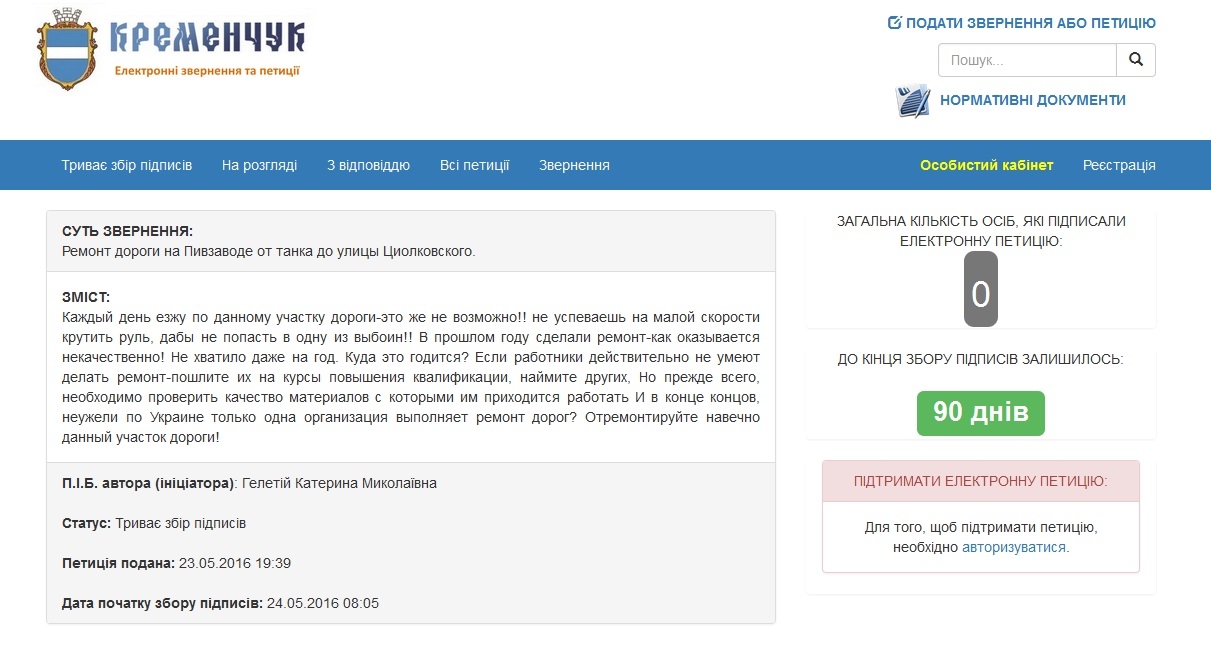 24 мая на сервисе электронных петиций мэрии появилось новое обращение к мэру Кременчуга Виталию Малецкому с просьбой отремонтировать дорогу от «танка» на пивзаводе до ул. Циолковского. Инициировала сбор подписей под этим предложением Катерина Гелетий, автор петиций о переименовании улицы Пролетарской в Кузьмы Скрябина и об установке на остановке «ул.Ковалёва» светофора с кнопкой.