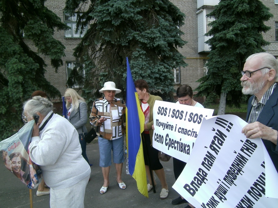 Сегодня, 25 мая, 7 жителей села Еристовка собрались на площади Независимости, под зданием Кременчугского районного совета, с флагами и плакатами.