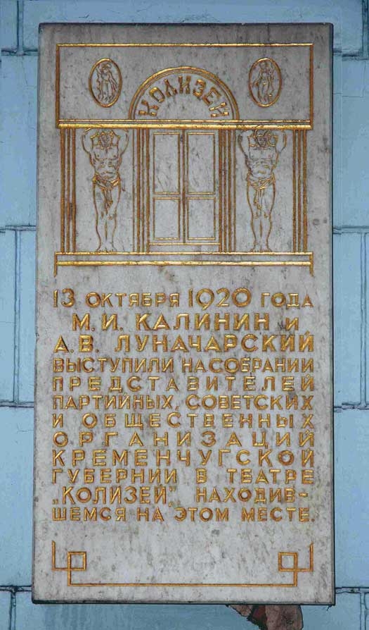 В Кременчуге на ул. Соборной (бывшая ул. Ленина) мраморную доску о выступлении коммунистов М. Калинина и А. Луначарского заменили. Теперь вывеска на доме №11 гласит, что «На этом месте в 1920 году находился кременчугский городской театр «Колизей».