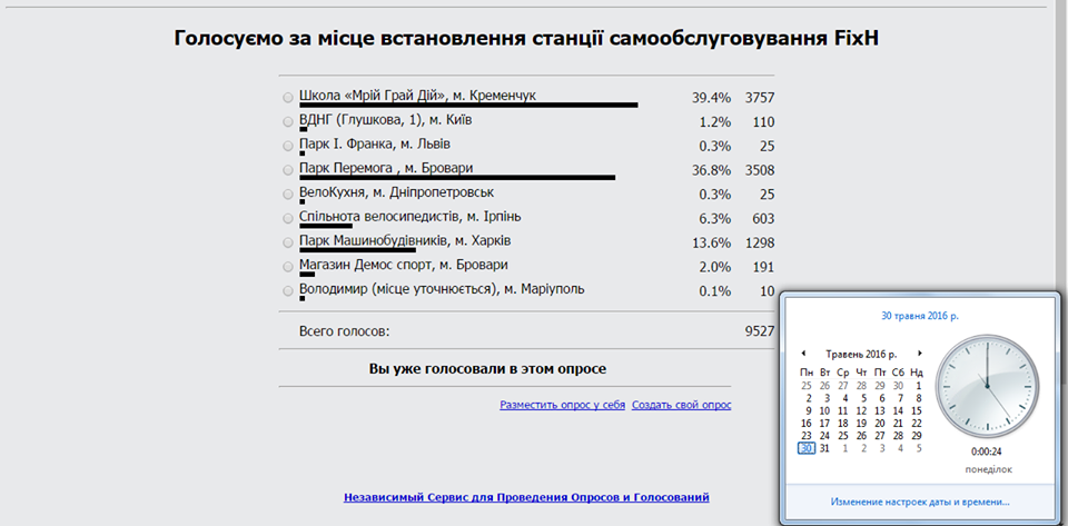 - Поздравляем победителей розыгрыша двух станций самообслуживания FixHere. По результатам голосования ими стали Андрей Левченко (Школа «Мрій, грай, дій», г. Кременчуг) и Александр Ладошкин (Парк Победа, г. Бровары). Также благодарим всех, кто принимал участие в розыгрыше, - написали организаторы.