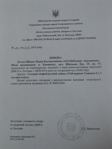 Наразі Марія знаходиться в онко-гематологічному відділенні Полтавської міської дитячої лікарні. Дівчинці роблять хіміотерапію.
