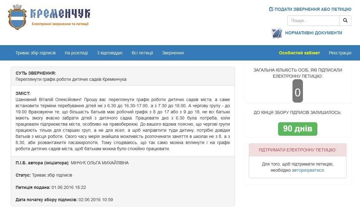 2 червня на сервісі електронних петицій мерії з'явилось нове звернення до мера Кременчука Віталія Малецького з проханням переглянути графік роботи дитячих садків міста, а саме: встановити терміни перебування дітей не з 6.30 до 16.30-17.00, а з 7.30 до 18.00, а чергову групу - до 19.00.