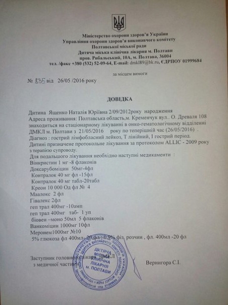 Дівчинка зараз знаходиться в онко-гематологічному відділенні Полтавської міської дитячої лікарні. Сьогодні, 3 червня, Наталці вдруге зробили хіміотерапію.