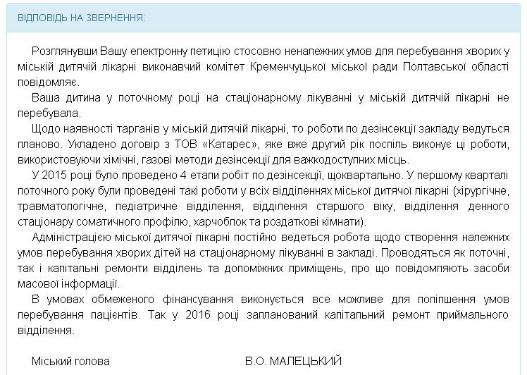 Також у відповіді градоначальник запевнив, що адміністрацією міської дитячої лікарні постійно ведеться робота щодо створення належних умов перебування хворих дітей на стаціонарному лікуванні в закладі. Проводяться як поточні, так і капітальні ремонти відділень та допоміжних приміщень. А у 2016 році запланований капітальний ремонт приймального відділення.