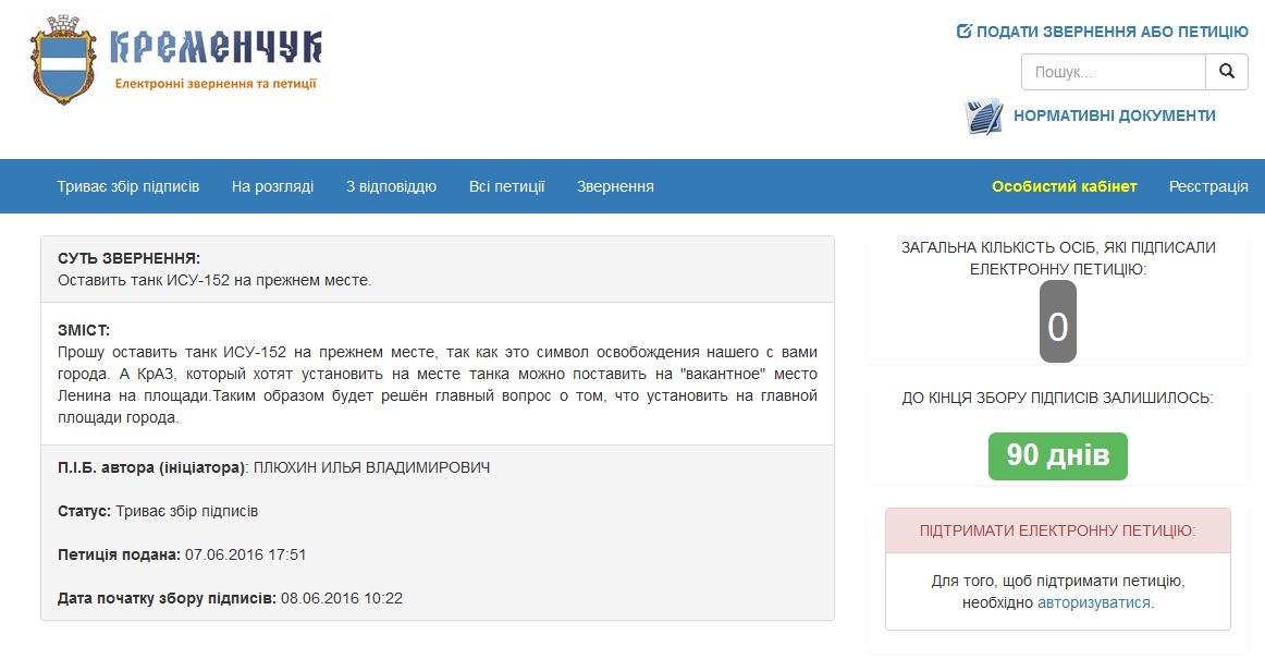 Нагадаємо, що раніше Дмитром Хмеликом була створена петиція з пропозицією демонтувати пивзаводівський «танк», а на його місце встановити КрАЗ-222, оскільки, на думку Дмитра, "кожна друга сім'я в нашому місті пов'язана з КрАЗом, завдяки цьому заводу виросло і розширилось наше місто, в цій машині - праця багатьох поколінь кременчужан". За 72 дня пропозиція Дмитра набрала всього 63 голоси із необхідних для розгляду 250.