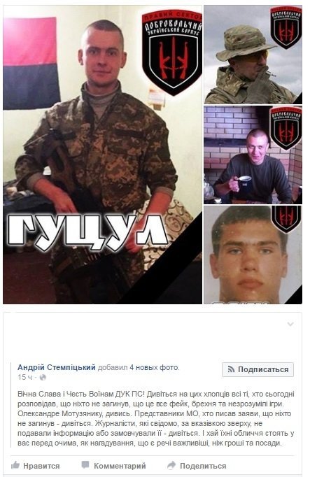 «Сьогодні на фронті внаслідок артобстрілу полягло 4 бійців Добровольчого Українського Корпусу «Правий сектор», 2 бійців «Айдару», близько 20 добровольців ДУКу, «Айдару» та військових ЗСУ отримали поранення», – йшлося у повідомленні, також у ньому усіх небайдужих закликали зібратися на центральних площах своїх міст та запалити свічки на знак пошани до загиблих воїнів.