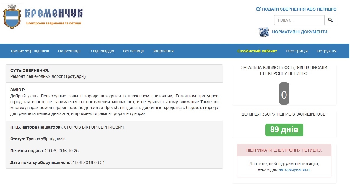 21 июня на сервисе электронных петиций мэрии появилось новое обращение к мэру Кременчуга Виталию Малецкому с требованием отремонтировать тротуары.