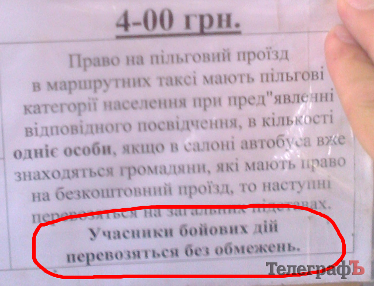 В Кременчуге маршрутки бесплатно возят участников боевых действий без ограничений. В автобусах можно увидеть сообщение об этом.