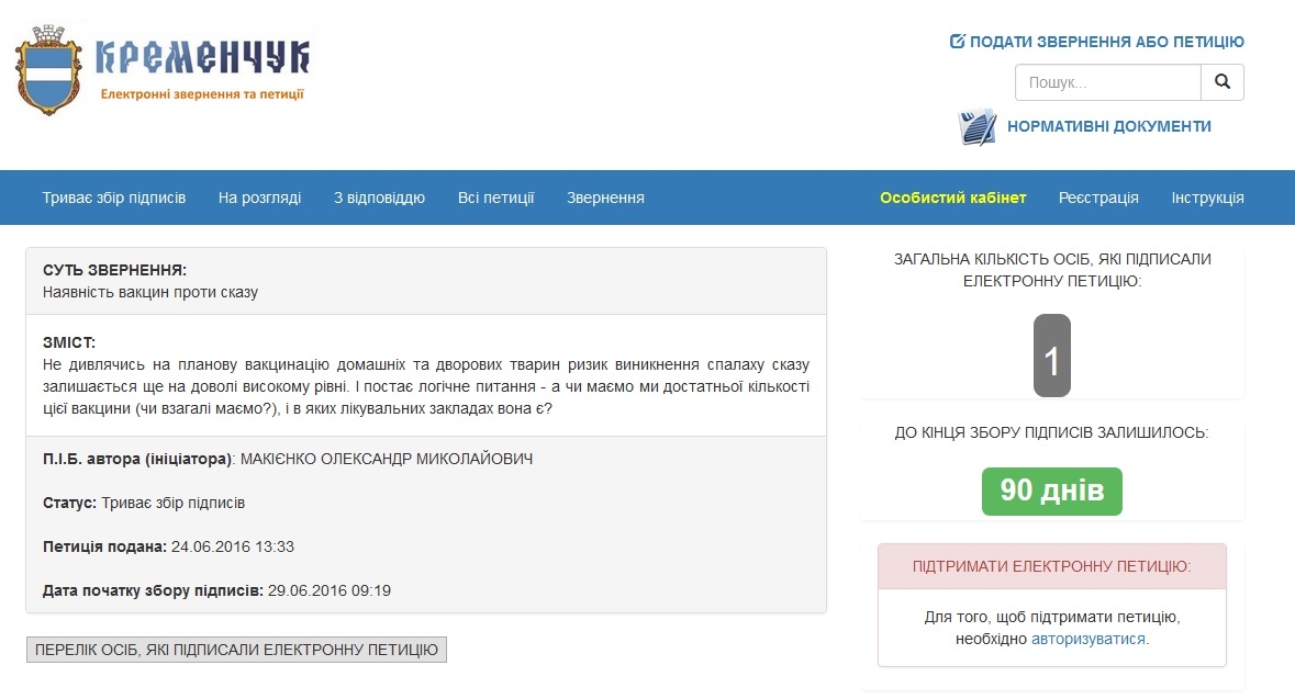 29 червня на сервісі електронних петицій мерії з'явилась нова петиція до мера Кременчука Віталія Малецького. Створив звернення Олександр Макієнко ще 24 червня, але оприлюднена воно лише сьогогдні.