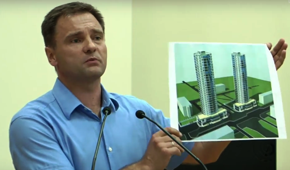 На сессии Кременчугского городского совета 30 июня директор строительной компании «Европабуд» показал, как будут выглядеть два 26-этажные здания в центре Кременчуга, которые он хочет построить. За два года, которые земля была у предприятия в аренде, оно заказало геологические исследования, а также изменения в Генплан города.