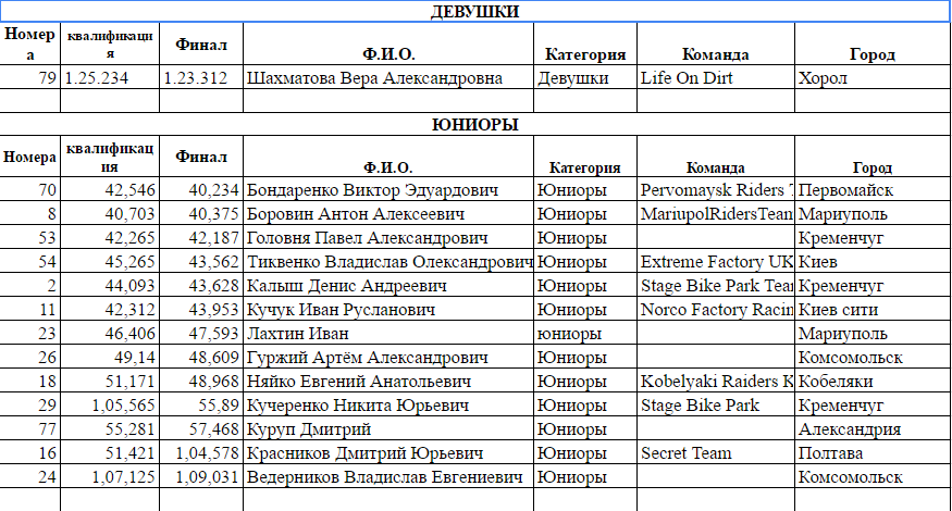 У категорії “юніори” кременчужанин Павло Головня завоював “бронзу” показав результат - 42,18 секунди. 5 місце у цій номінації посів Денис Калиш, а 10 місце - Микита Кучеренко.