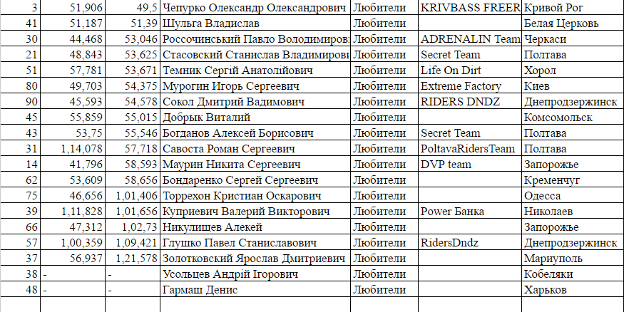 У найчисельнішій категорії “еліта” змагалися 37 спортсменів. Кременчужанин Сергій Бондаренко посів 30 місце з результатом 58,65 секунд.