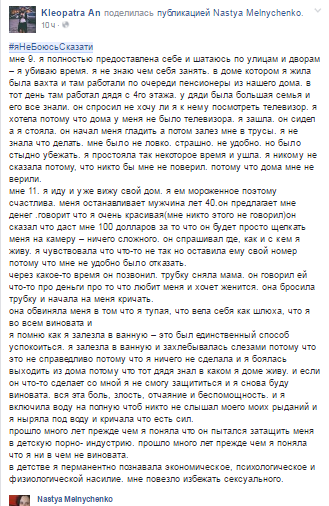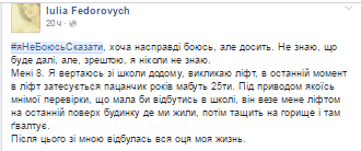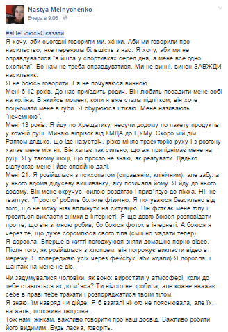 В Украине в сети Facebook под хештегом #яНеБоюсьСказати украинки делятся историями о насилии над ними или их близкими. Начала кампанию журналистка Анастасия Мельниченко, которая в своем посте сообщила о нескольких случаях из своей жизни.