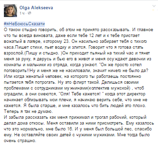 Всего за несколько часов своими историями поделились сотни женщин, была и история от мужчины. Он рассказал о том, как в 5 лет в Санкт-Петербурге его "затащили в подъезд, раздели, лапали, но не изнасиловали".