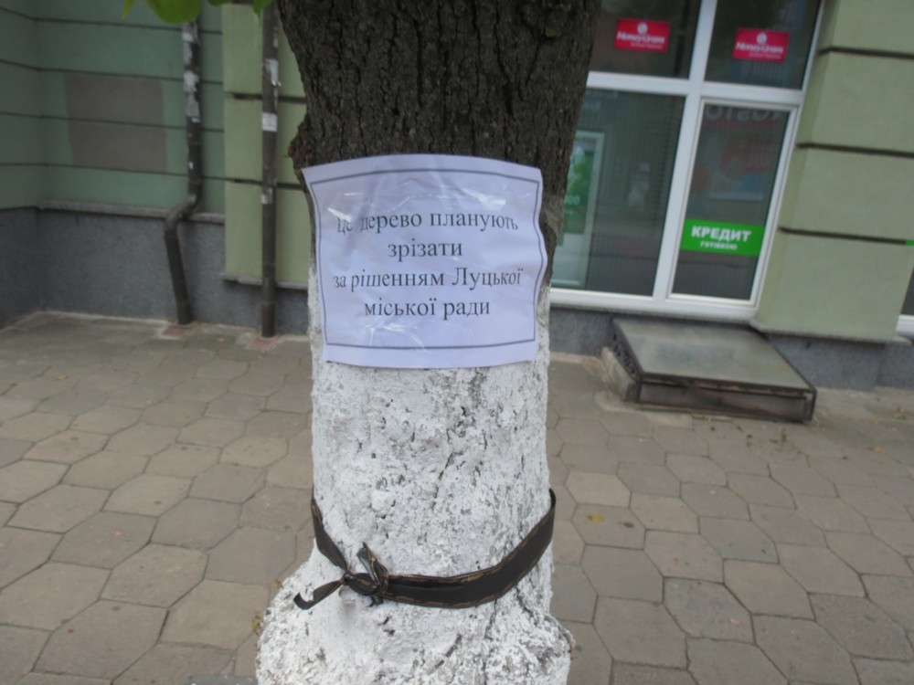 - Лучани зробили флешмоб з деревами. Вони обмотують дерева чорною траурною стрічкою або ставлять таблички вказуючи вік та вид дерева. За рішенням міської ради дерева вирубують, щоб замінити плитку на дорогах. Люди говорять, що плитка у хорошому стані, та й дерева нещодавно кронували, - розповів Олександр про методи боротьби лучан з рішенням міської ради вирубати дерева.