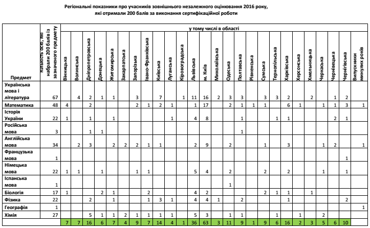 В Україні 258 осіб отримали найвищий бал, з них семеро мають 200 балів з двох предметів. Найбільше 200-бальників у Києві – 63 особи, Львівській області – 36, Харківській та Дніпропетровській областях по 16 осіб, Київській області – 14, Полтавській – 11 осіб.