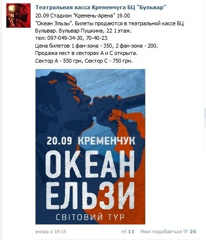 Напомним, что билеты также продаются в театральной кассе БЦ «Бульвар», возможно, там ещё можно купить билет за 200-350 гривен.