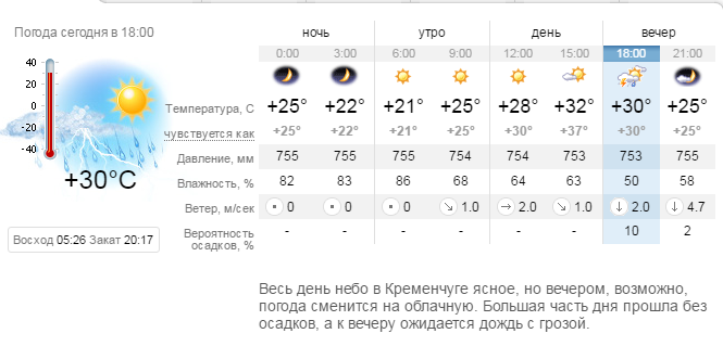 Вечером 7 августа синоптики предрекают кременчужанам грозу. По состоянию на 18.00 небо безоблачное и температура воздуха примерно +32°С. Но все может измениться в считанные часы.