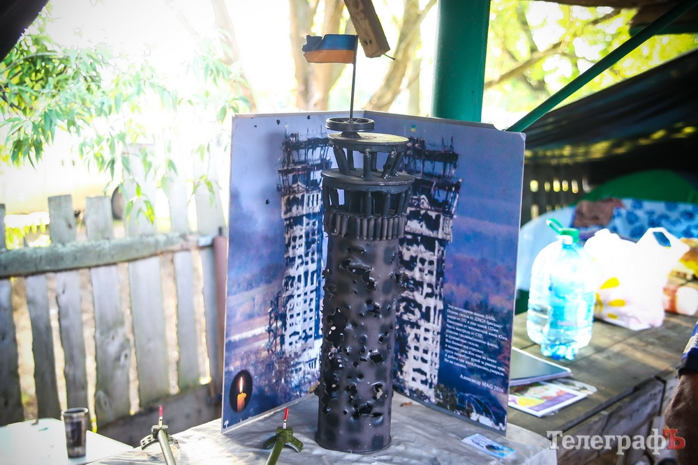 Також хлопці привезли зменшену копію башти Донецького аеропорту. Вона виконана з гільзи 150-го калібру, елементів РПГ та автоматних гільз, а прапор на її вершині виконаний з елементів корпусу Граду. Цей експонат не продається - він відправиться до столичного музею.