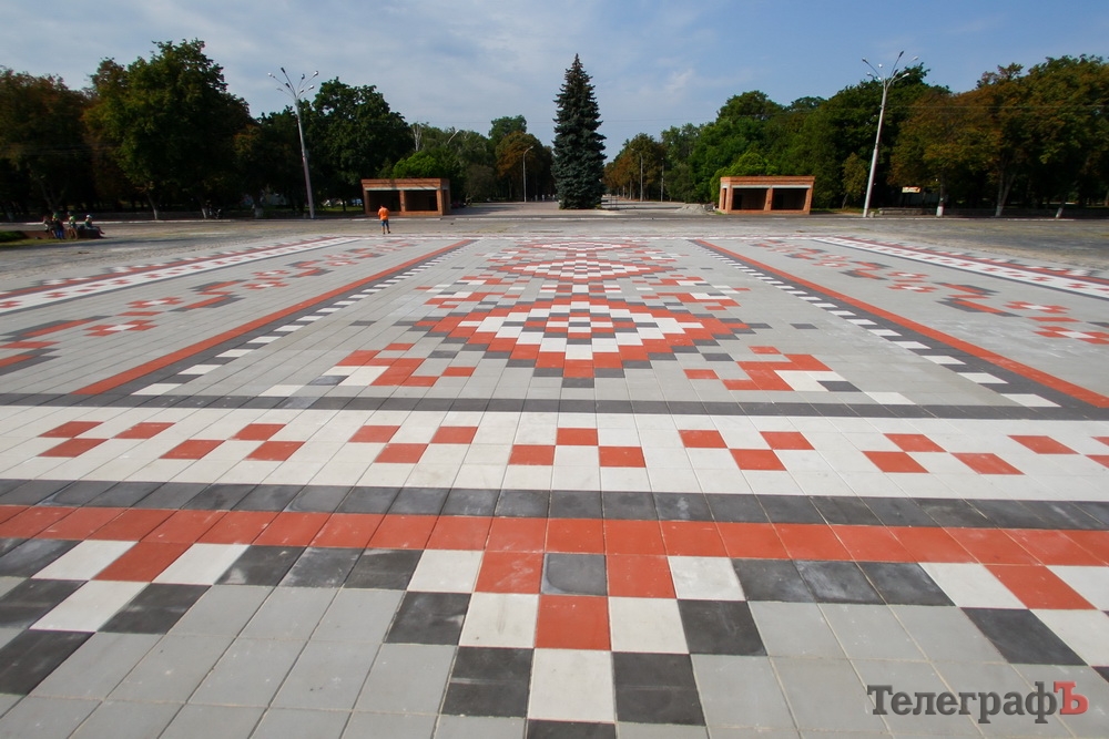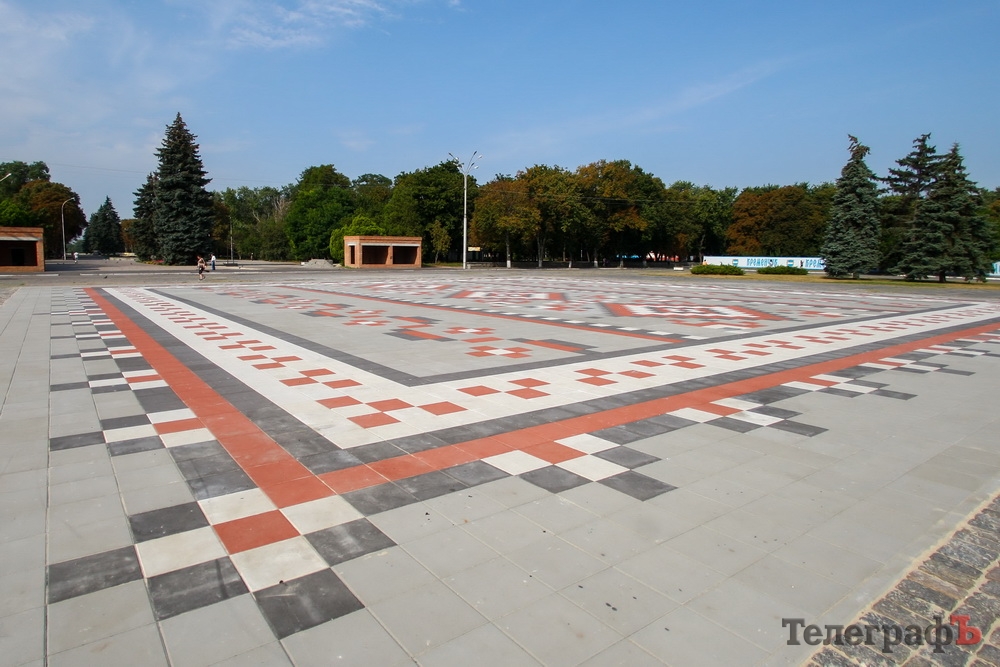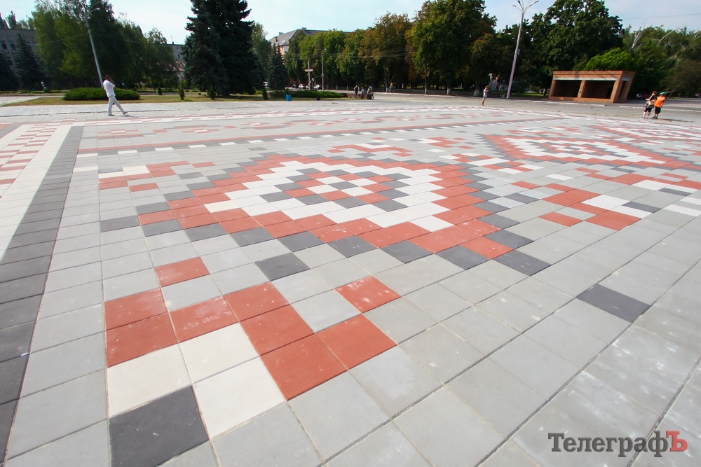 На выходных на площади Победы в Кременчуге строители закончили выстилать разноцветной плиткой вышиванку. Теперь здесь нет ни Ленина, ни постамента от него, прозванного в народе «стаканом».