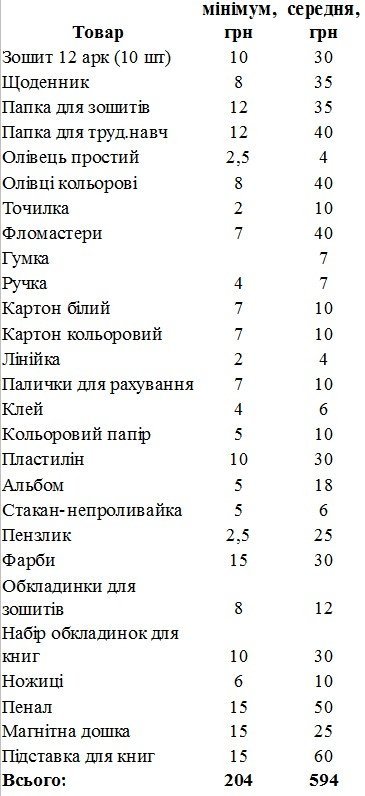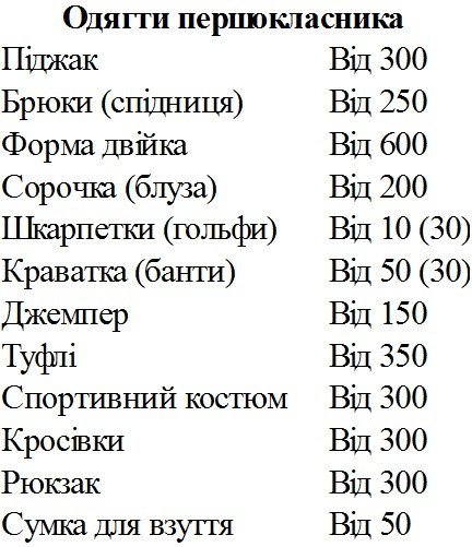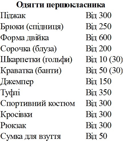 У таблиці наведений чи не найбюджетніший варіант «комплектації» першачка у магазині та на ринку, але ж батькам хочеться, аби речі були якісними, а за якість доведеться платити дорожче.