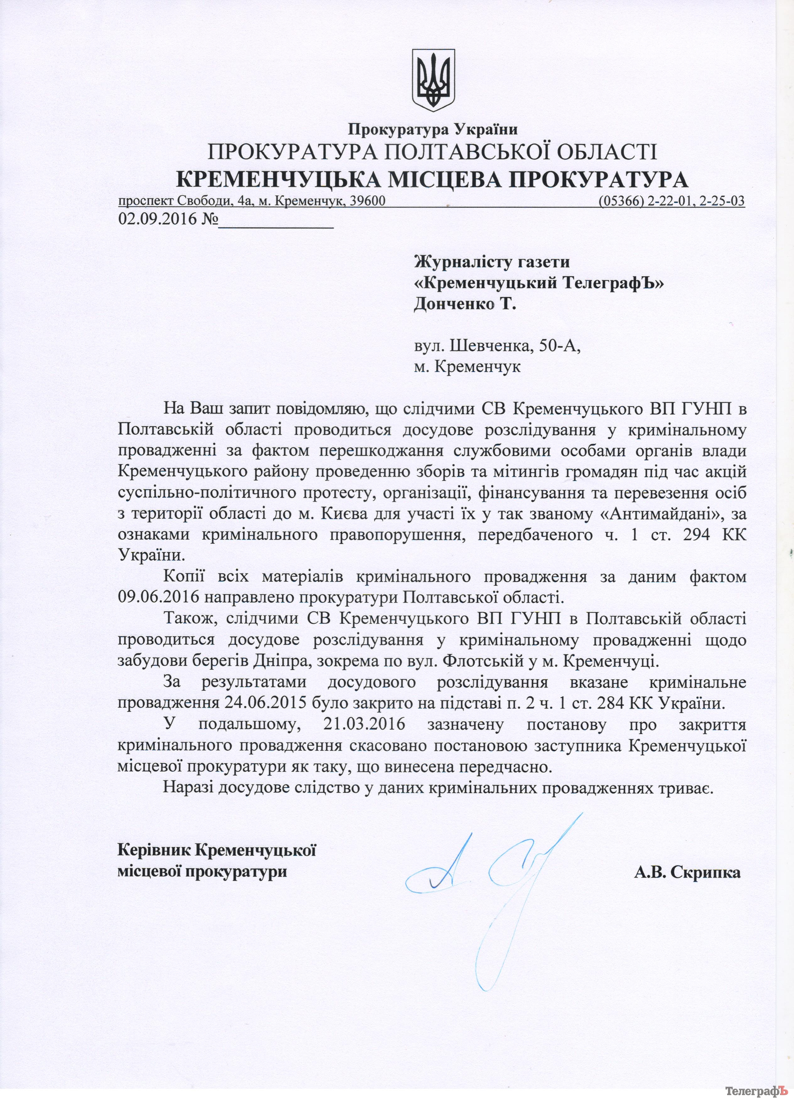 Как сообщает сегодня Кременчугская местная прокуратура, копии материалов дела 9 июня направлены в прокуратуру Полтавской области.