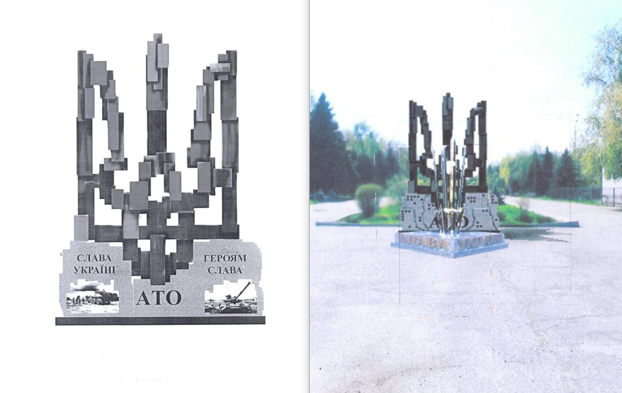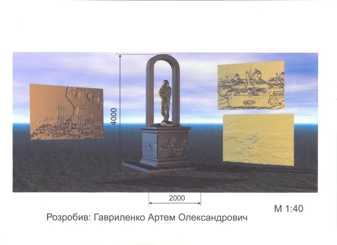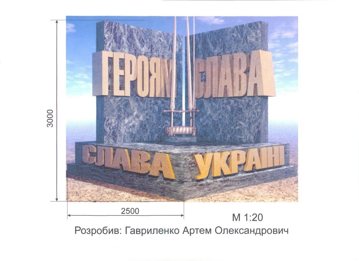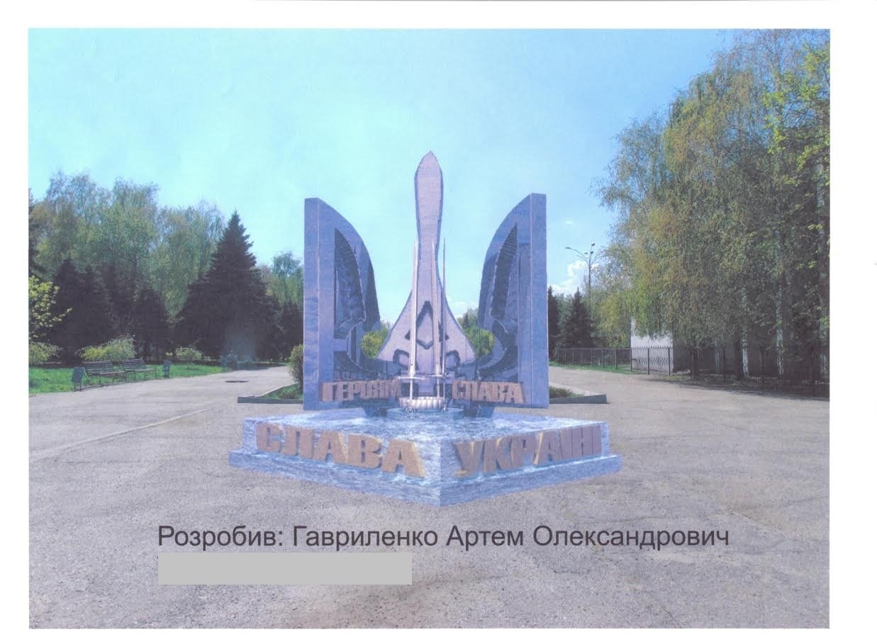 Композиція, запропонована Артемом Гавриленком, складається з основи та герба. Герб стилізований фрактальними (дрібними) елементами із габро. На них є можливість розмістити ілюстрації та написи прізвищ імен загиблих учасників АТО.