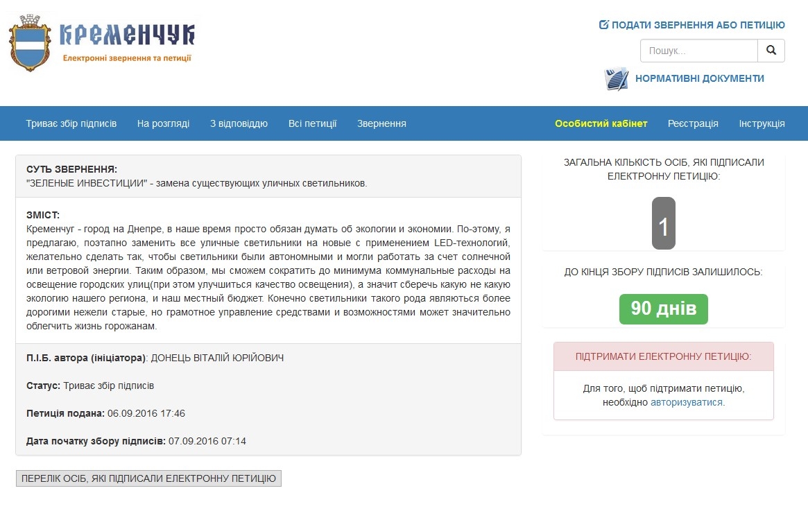 7 сентября на сэрвисе электронных петиций мэрии появилось новое обращение к мэру Кременчуга Виталию Малецкому с предложением поэтапно заменить все уличные светильники на новые с применением LED-технологий, которые были бы автономными и могли работать за счет солнечной или ветровой энергии.