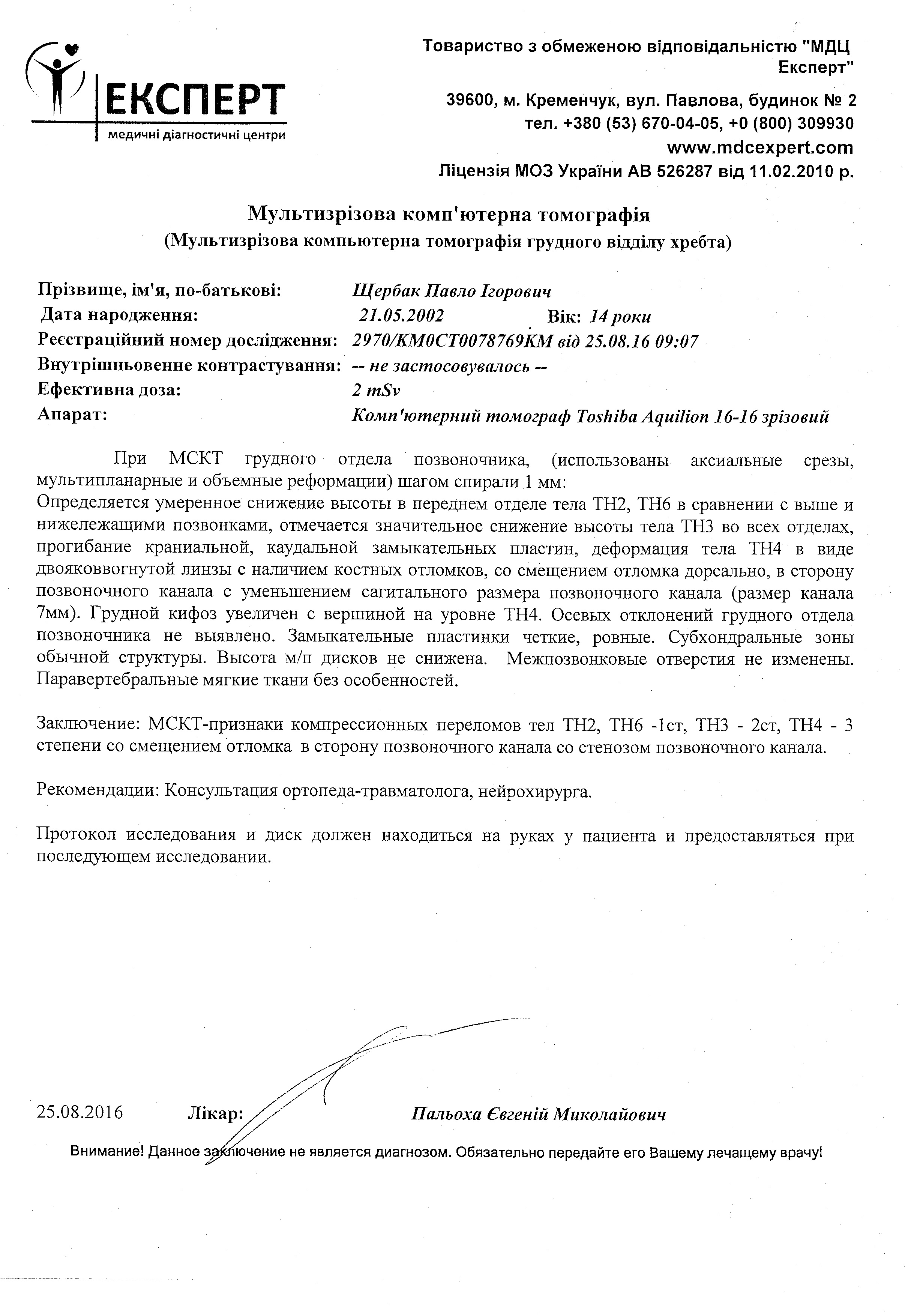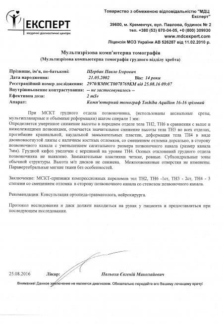 Перелом 4 грудних хребців 14-річний Павло Щербак отримав наприкінці літа, 20 серпня. За словами мами Лариси Чепурної, син купався з однолітками у Сухому Кагамлику і невдало пірнув, стрибаючи з дерева. Кременчужанин зараз проходить лікування у травматологічному відділенні Дитячої лікарні. Йому необхідна операція в Харківському інституті патології хребта та суглобів ім. Ситенка.