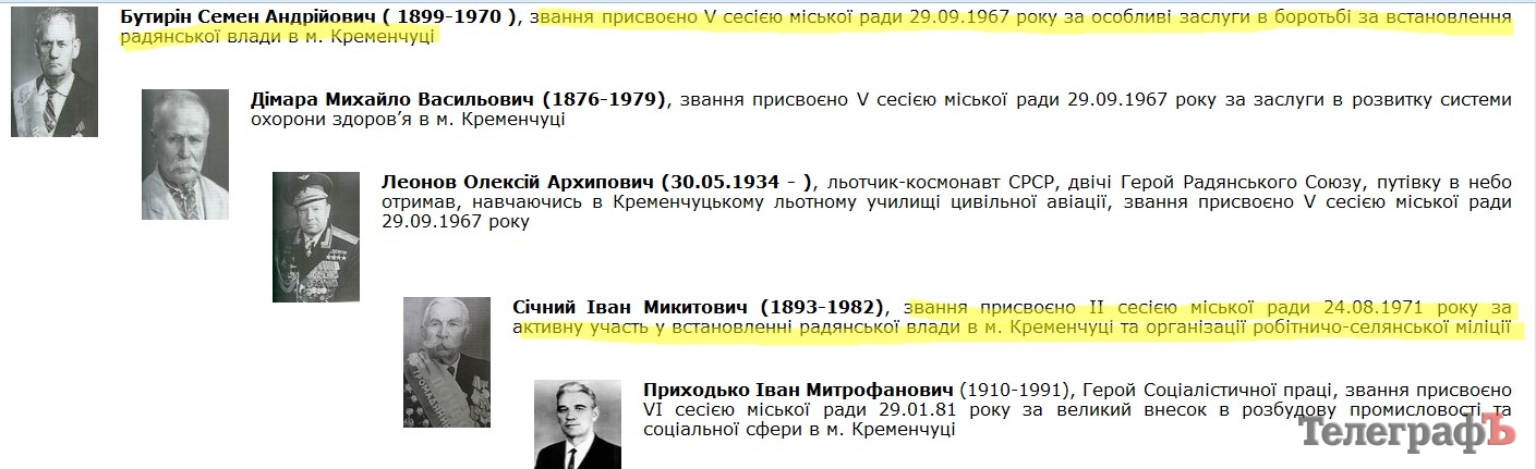 Наразі ж офіційний сайт Кременчуцької міської ради популяризує імена компартійних діячів - Почесних громадян, що суперечить закону про декомунізацію.