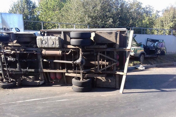 После столкновения грузовик перевернулся, а ВАЗ стал «кабриолетом». Автомобилю оторвало крышу.