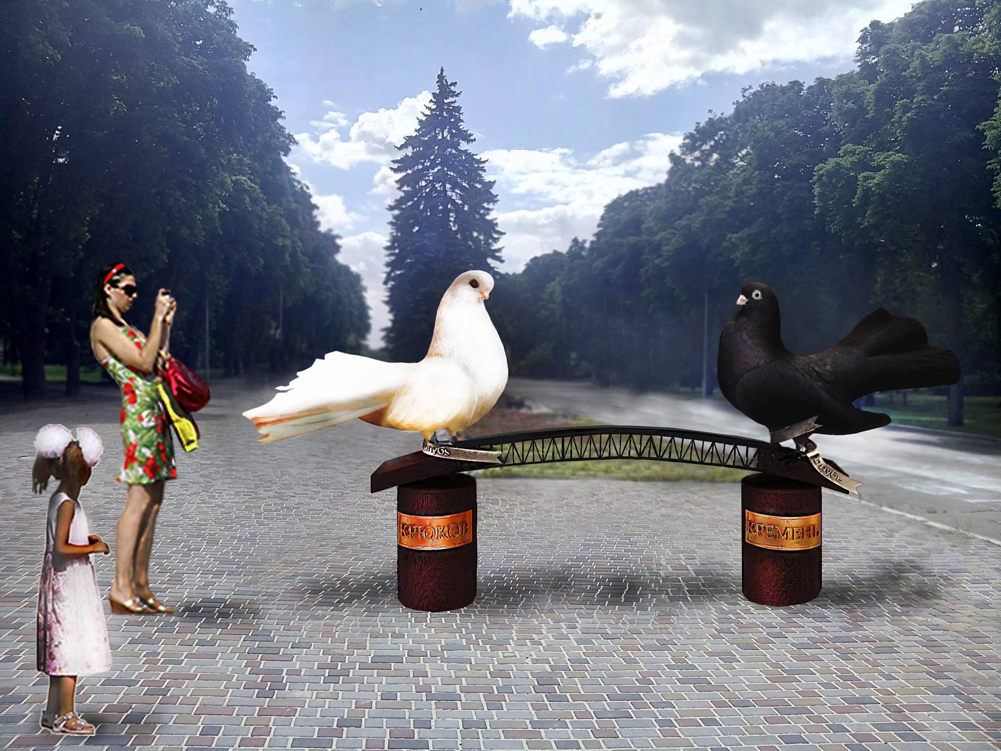 Дмитрий Ив – серебряный призер фестиваля современного искусства Passion for Freedom 2015 в Лондоне. У него 15 реализованных масштабных проектов в разных странах. Работы харьковчанина находятся в частных коллекциях Украины, Германии, Франции, Италии, в том числе у известной певицы Патрисии Каас. На эскизе Дмитрия мы видим голубей в цвете, форма памятника в виде лавочки, которая символизирует Крюковский мост, объединяющий Крюков и Кременчуг.