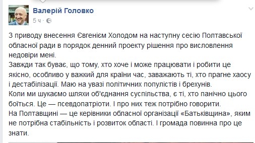Проект решения о недоверии губернатору подготовил кременчужанин Евгений Холод ("Батьківщина"), заместитель председателя Полтавского облсовета. Губернатор Валерий Головко отреагировал на проект решения на своей странице в Фейсбуке, назвав представителей партии "Батьківщина", выступивших против него "популистами и брехунами".