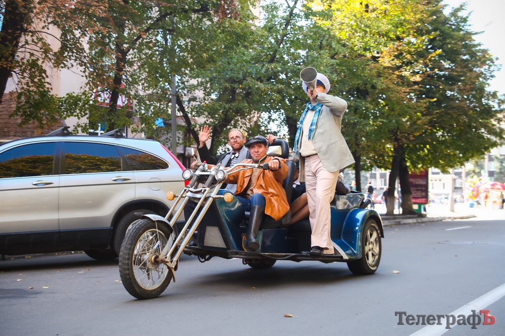 Сегодня, 24 сентября, во время празднования Дня города, на улицах Кременчуга можно увидеть персонажей из романов Ильфа и Петрова – Остапа Бендера, Кису, Эллочку-людоедку и Шуру Балаганова.