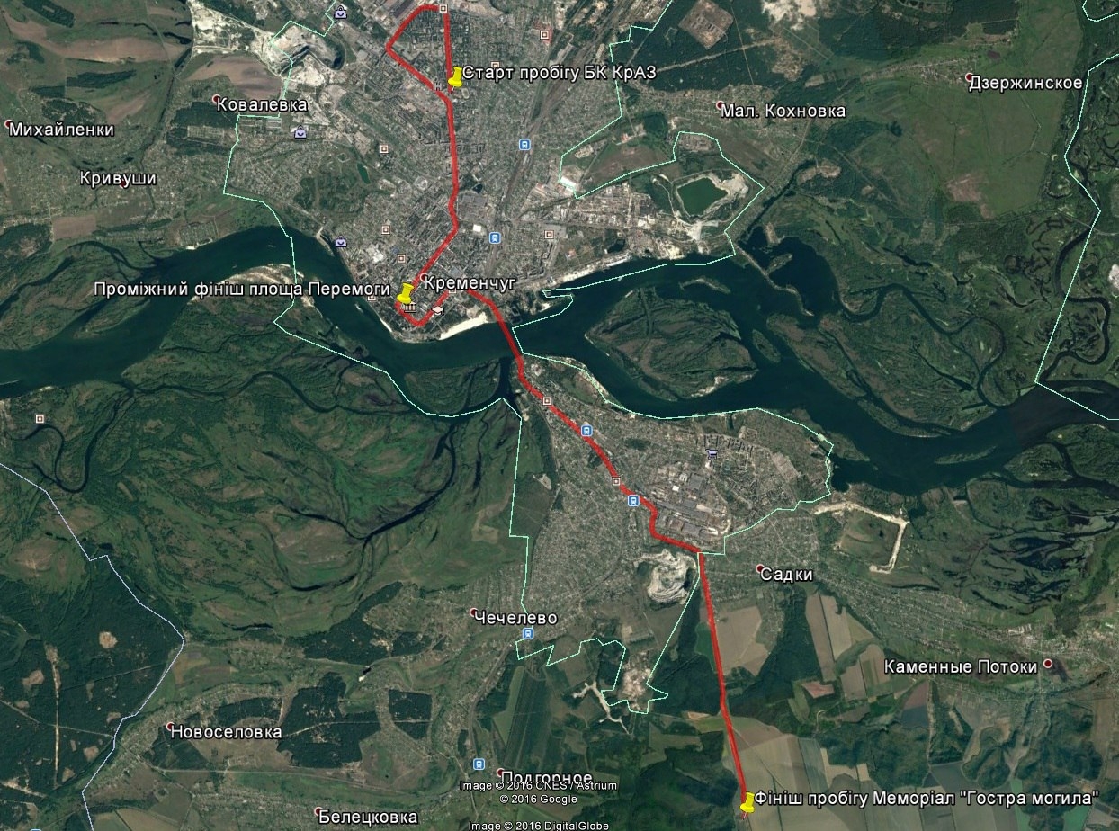 Площа Перемоги стала лише проміжним фінішем на маршруті, далі частина колони вирушила через Крюківський міст до меморіалу «Гостра могила» (Деївка), щоб покласти квіти до могили льотчика Виноградова та вклонитися пам’яті людей, які віддали свої життя за визволення Кременчука.