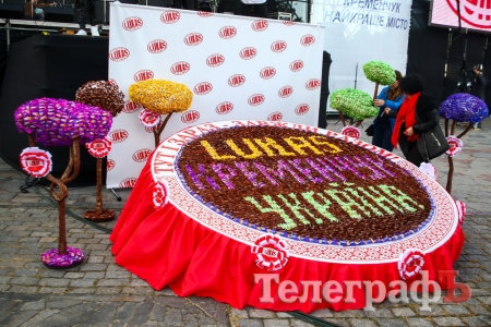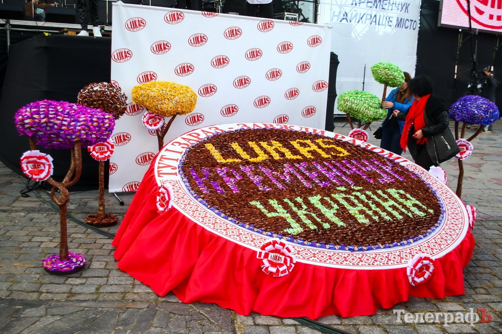 Ну, а торт с удовольствием съели кременчужане прямо на площади Победы — кременчугский рекордсмен и производитель сладостей "Лукас" радушно угощал всех желающих, здесь же состоялась дегустация конфет.