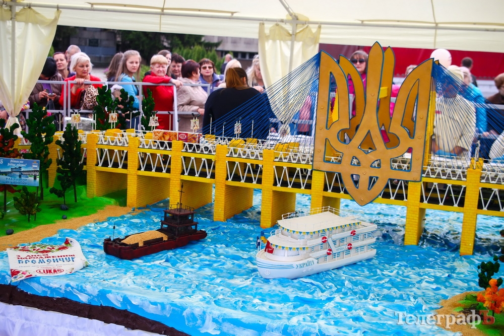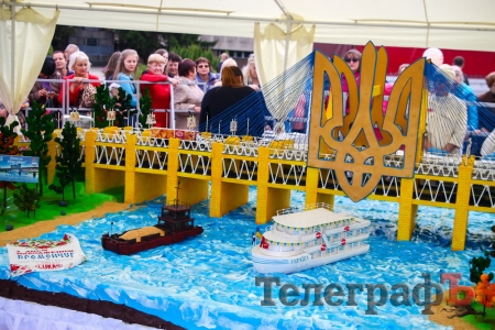 И это не просто торт, а настоящее произведение искусства! Обычно фототорт бывает плоским. А здесь зрители увидели панораму с рекой Днепр, мостом, поездом и катером. Составлен этот гигантский торт из 72 сегментов. И воплощает месту кременчужан — новый мост, но пока он только из мастики и кондитерской глазури. Параметры «тортика» таковы: