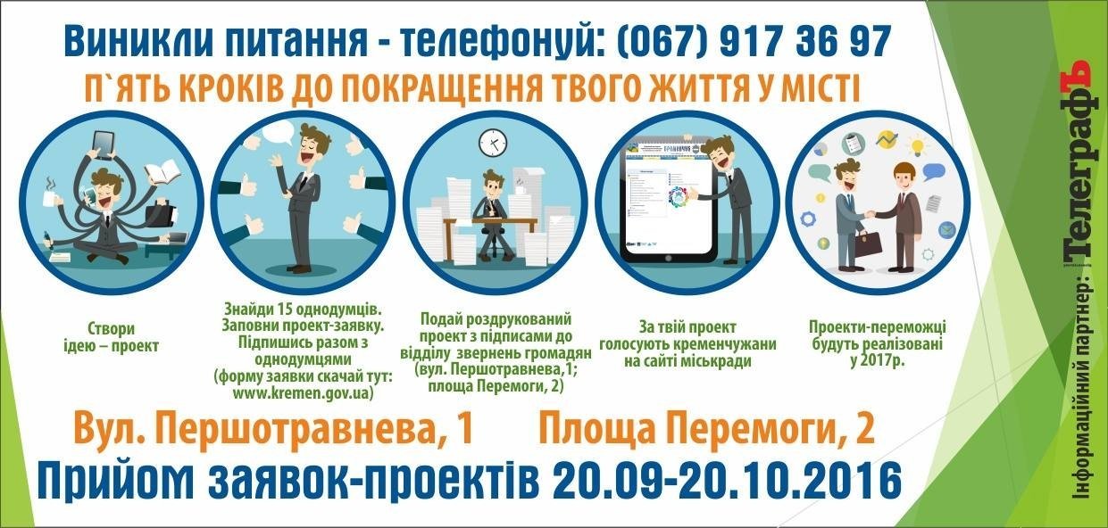 Напоминаем, в Кременчуге с 20 сентября стартовал прием заявок от жителей для участия в «общественном бюджете». Подавать проекты можно в течение месяца – до 20 октября.