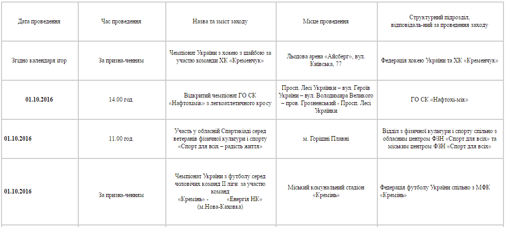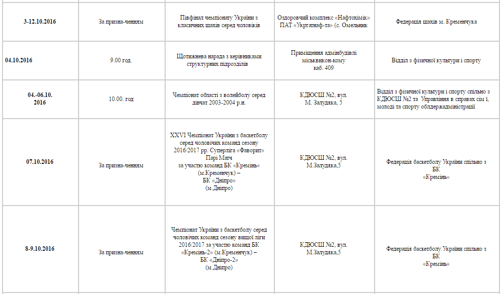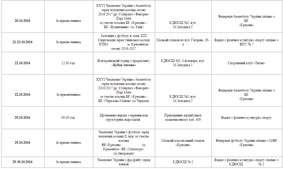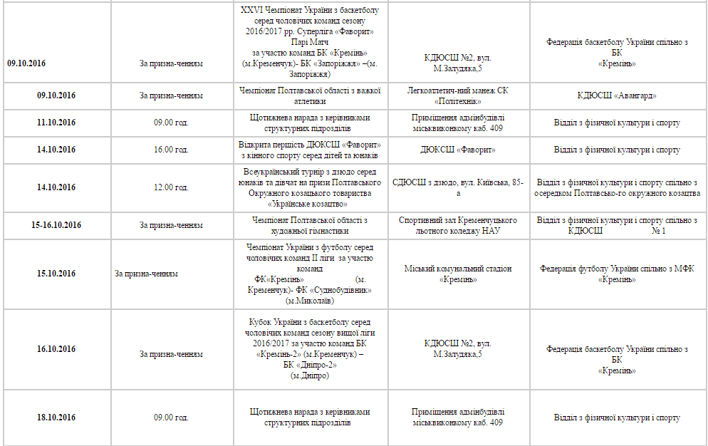 План спортивних заходів у Кременчуці. Жовтень