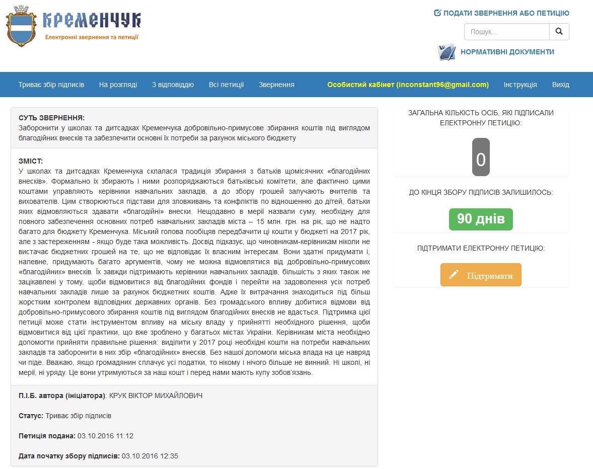 Сьогодні, третього жовтня, на сервісі електронних петицій мерії з'явилось нове звернення до мера Кременчука Віталія Малецького. Кременчужанин вимагає «заборонити у школах та дитсадках міста добровільно-примусове збирання коштів під виглядом благодійних внесків та забезпечити основні їх потреби за рахунок міського бюджету».